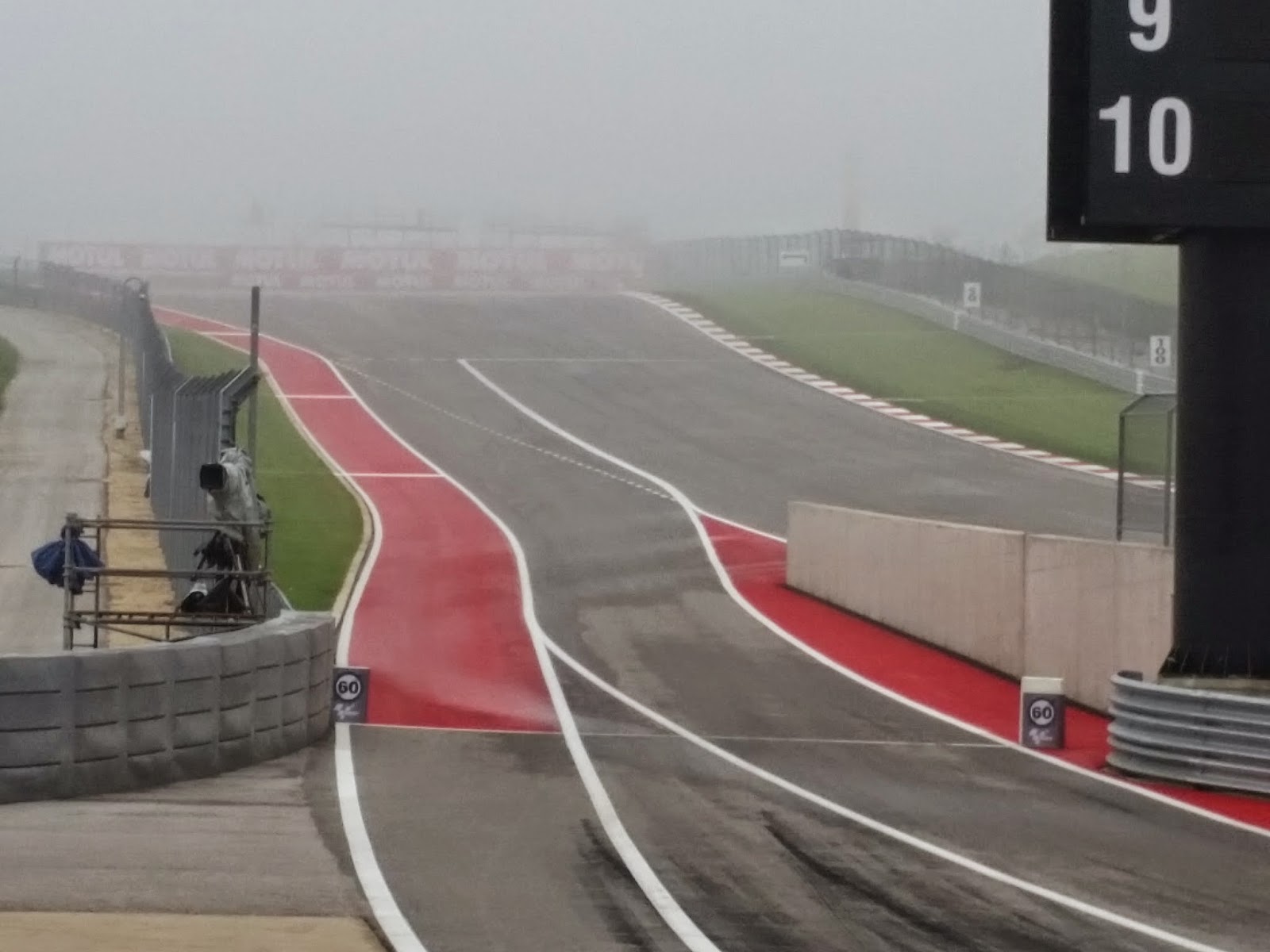 Looking up the hill to turn 1 Sunday morning and waiting for the fog to lift